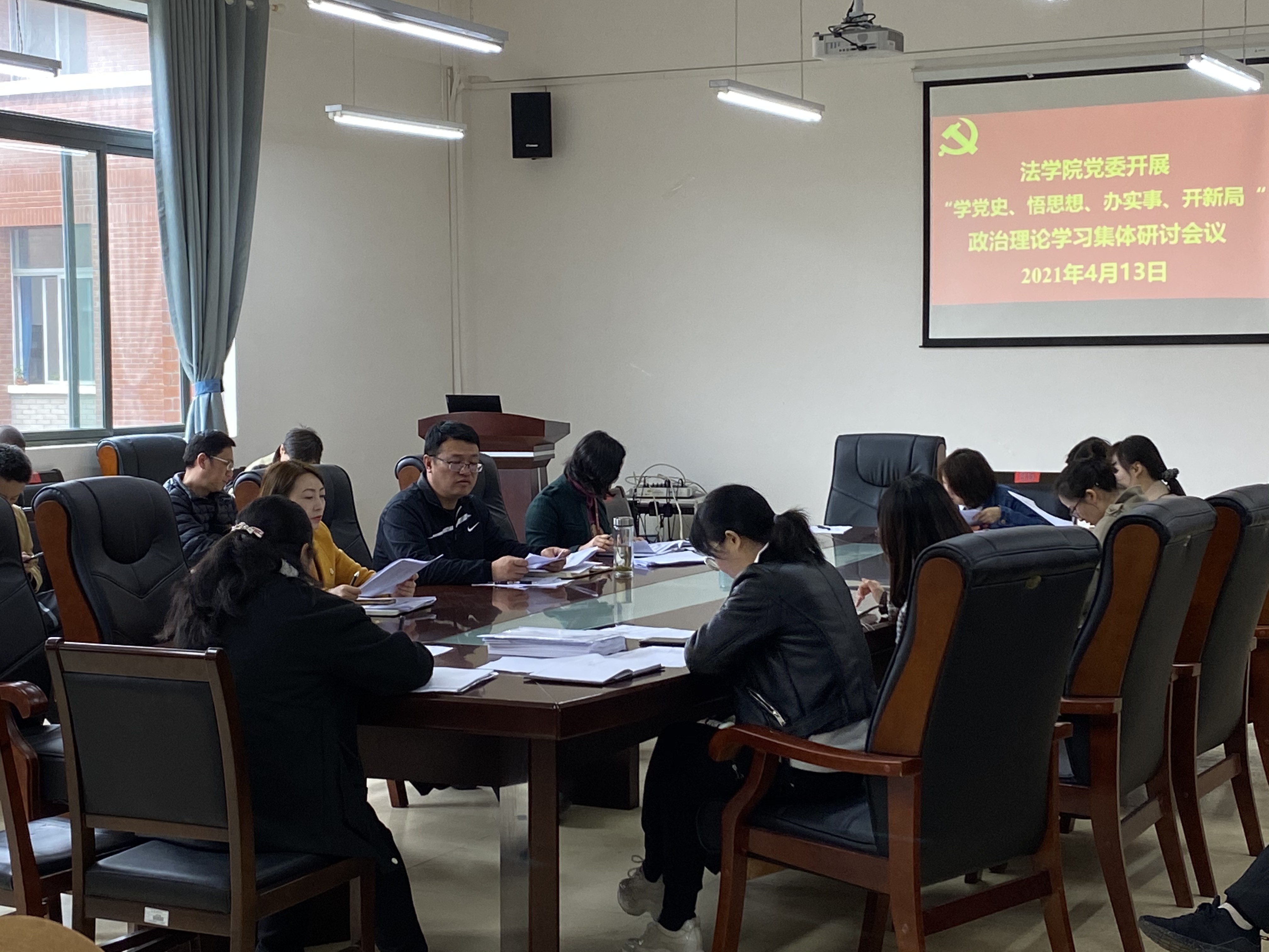 2021年4月13日下午,法学院党委在文德楼A8-310会议室组织召开“学党史、悟思想、办实事、开新局”政治理论学习集体研讨会议。院领导及全院教职工出席会议,院党委书记詹伟主持会议。