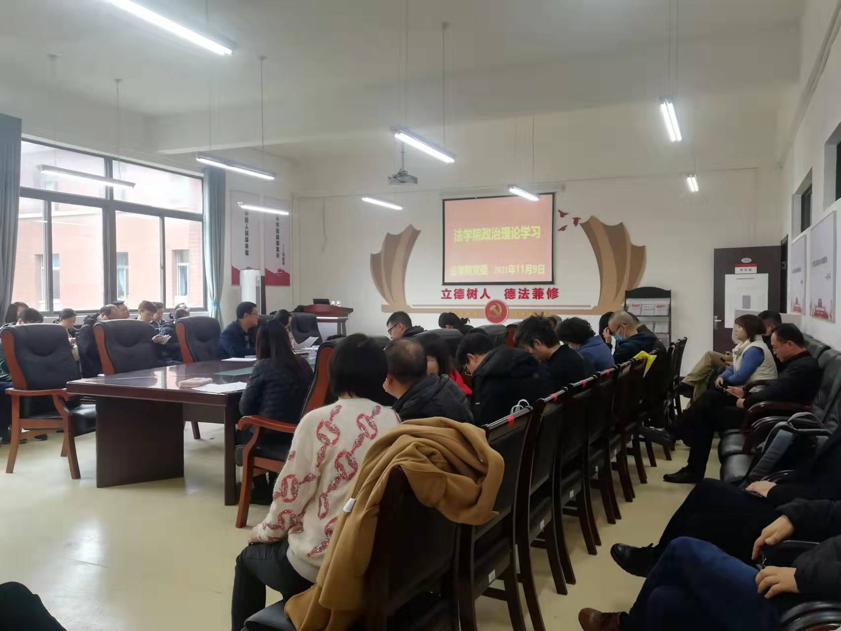 (法学院 图文/母桂花)2021年11月9日下午,法学院党委在文德楼A8-310会议室召开第十六次教职工政治理论集体学习暨做党和人民满意的“四有”好老师专题研讨会。院领导及全院教职工出席会议,院党委书记詹伟主持会议。