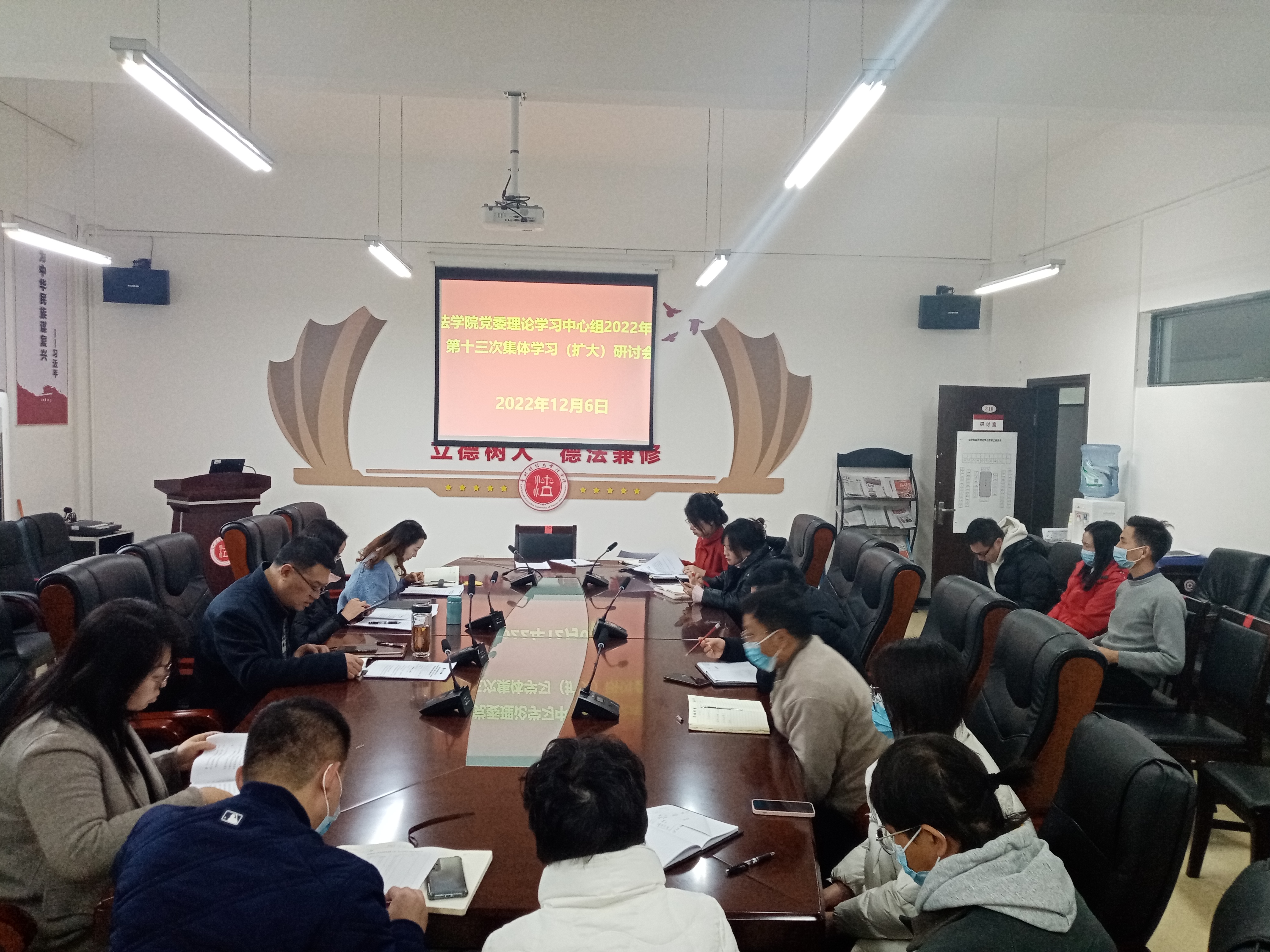 (法学院 图文/报道 徐方)2022年12月6日,法学院党委理论学习中心组围绕“党的二十大、省委十三届二次全会精神”专题集中学习研讨。学院领导及全体行政人员、支部书记参加会议,党委书记詹伟主持会议。