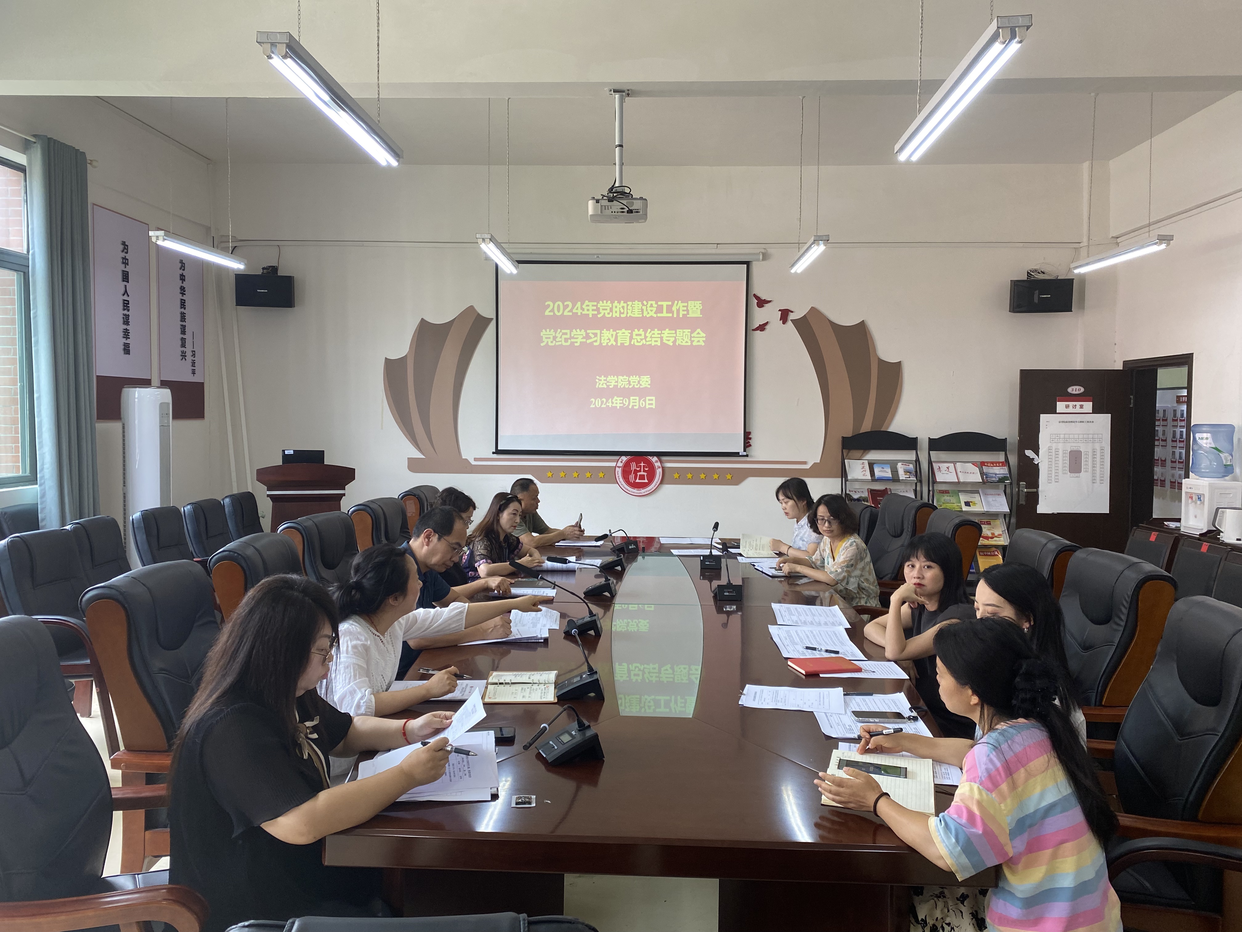 (法学院 向涛 图文/报道)2024年9月6日上午,法学院在文德楼310会议室召开党的建设工作暨党纪学习教育总结专题会,院党政班子成员、党支部书记、专职组织员参加,会议由党委书记邵新顺主持。