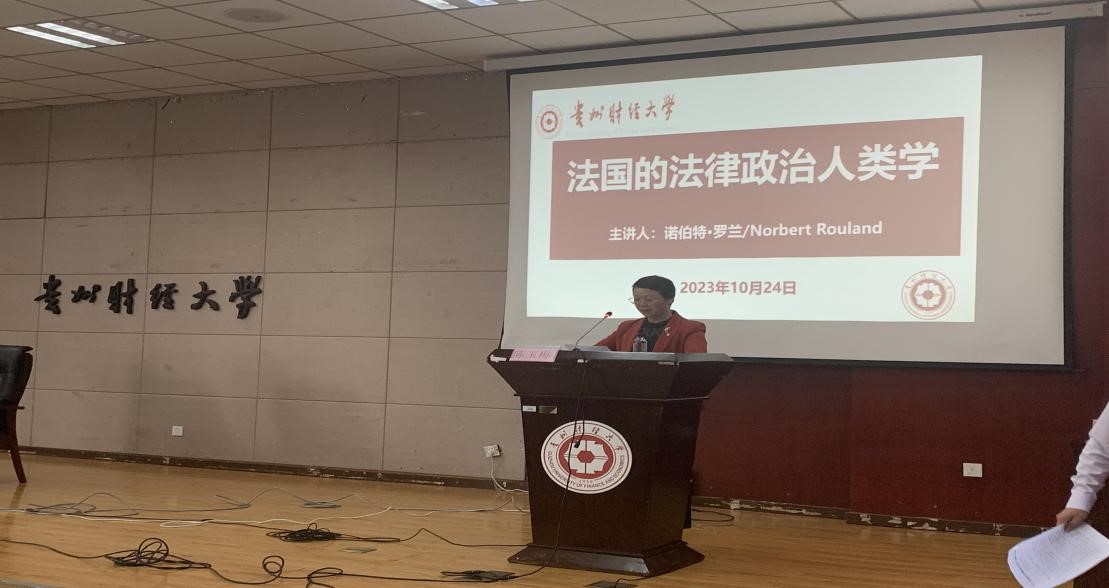 讲座伊始,陈玉梅院长代表学校和学院致欢迎词,在简单介绍贵州财经大学及法学院基本情况的基础上,感谢Rouland教授对我院法学学科的指导与帮助,并对Rouland教授莅临我院讲学表示热烈的欢迎。