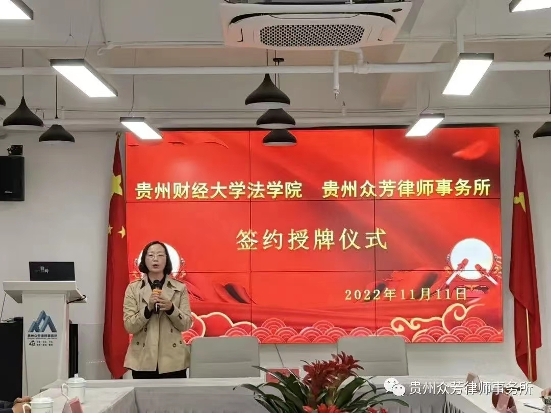 签约暨授牌仪式由陈仕菊主持,陈仕菊首先对陈玉梅一行的到来表示热烈的欢迎和真诚的感谢,并介绍了贵州众芳律师事务所的成立及发展历程。陈玉梅对开云在线(中国)唯一官方网站的成长历史及师资力量做了系统的介绍,并表示希望以设立校外实践教学基地的方式丰富教学内容,加强教学理论与实践的结合,提高学生综合素质和社会适应能力。