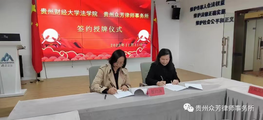 授牌仪式现场,开云在线(中国)唯一官方网站和贵州众芳律师事务所签订了《实践教学基地合作协议》。今后,双方将进行全方位、多层次的深入合作,包括互相提供平台,互派人员交流,建立学习、培训和交流机制,共同进行律师事务及律师业务发展方面的理论研究和课题研究。