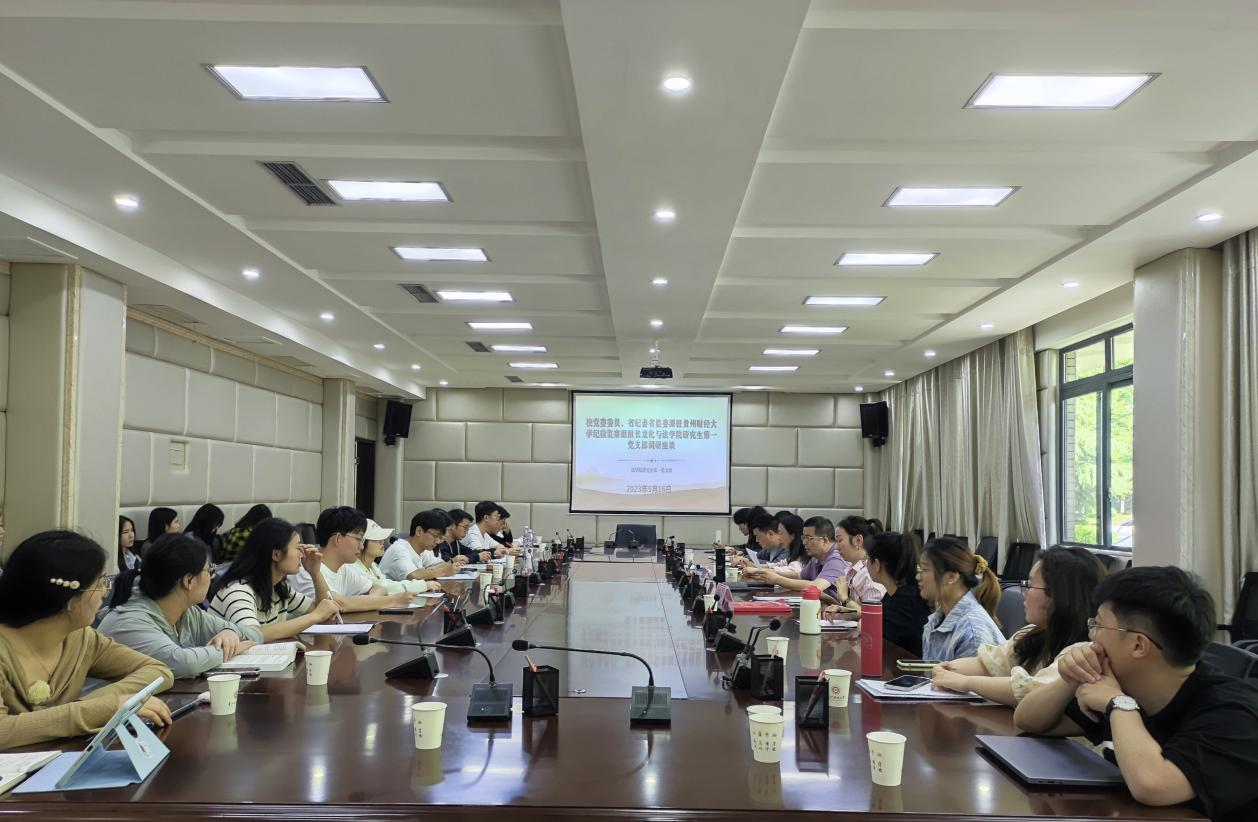 (法学院 图文/报道 田露丹)5月16日下午,校党委委员、省纪委省监委派驻贵州财经大学纪检监察组组长龙化在立德楼104会议室,与所联系的法学院研究生第一党支部开展调研座谈,省纪委省监委派驻贵州财经大学纪检监察组相关人员,法学院相关人员及支部部分党员和积极分子参会。