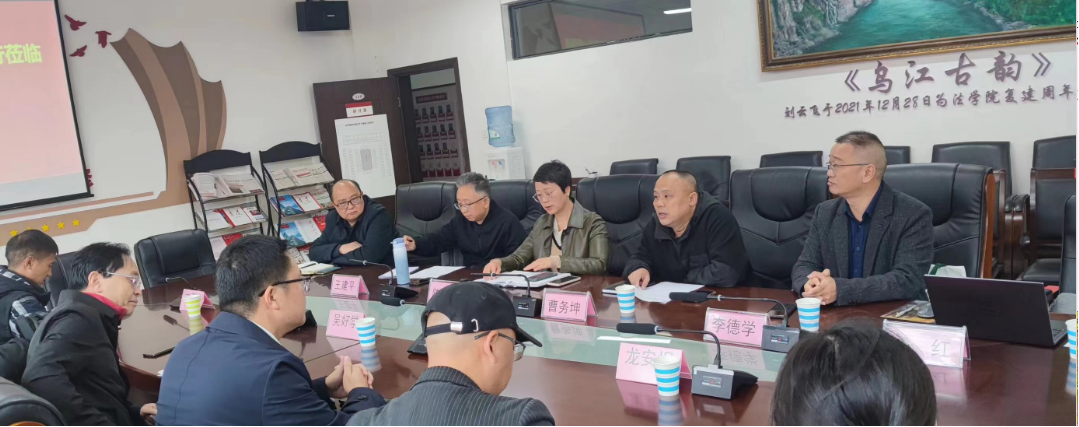 曹务坤对吴好学一行的到来表示热烈欢迎,陈玉梅介绍法学院发展情况,希望各位专家从人才需求、品牌建设及社会服务等方面给我院提建议。